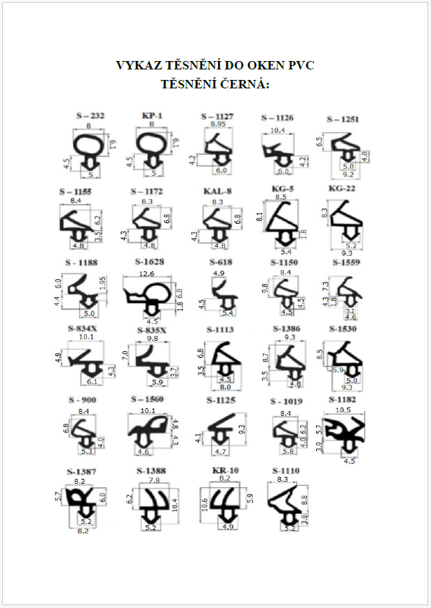 - 30 různých modelů těsnění v úsecích o délce cca 9 cm, v černé barvě